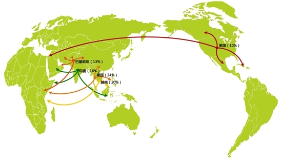 全球稻米出口量排名前五位的国家依次为泰国、越南、巴基斯坦、印度和美国,占世界稻米年出口量的80%左右。其中,泰米由于品种丰富、米质优良,是稻米出口业的标杆,出口量连续30年居全球首位,泰米价格也是国际米市行情的基准。近五年,泰国稻米年均出口量约为820万吨,2011年,泰米出口1067万吨,达到历史峰值;2012年,受泰国政府大米典押新政策影响泰米出口价格攀升,使得该国与越南、印度等主要出口国相比,竞争优势减弱,稻米出口量大幅下滑,降至650万吨的历史低位,泰国也因此丧失了世界第一大稻米出口国的称号,到2013年这一形势仍未打破。泰国稻米主要出口到非洲和亚洲地区,约占其出口总量的80%,中国是泰国在亚洲地区最大的稻米进口国。越南近五年稻米年均出口量680万吨,为全球第二大稻米出口国,该国稻米主要出口到中国和菲律宾,其次是非洲国家和印度尼西亚、马来西亚等其它亚洲国家。印度近五年来稻米年均出口量573万吨,2012年,由于印度在大米丰收背景下取消大米出口禁令,印度稻米出口量激增,上升到975万吨,较上年增长近一倍,创造了印度稻米出口的历史之最,印度超过泰国,首次成为世界最大稻米出口国。印度稻米主要出口到非洲国家和印度尼西亚。此外,近五年,年均稻米出口量排名第四和第五位的国家为巴基斯坦和美国,其中巴基斯坦年均出口量为345万吨,美国年均出口量为337万吨。
