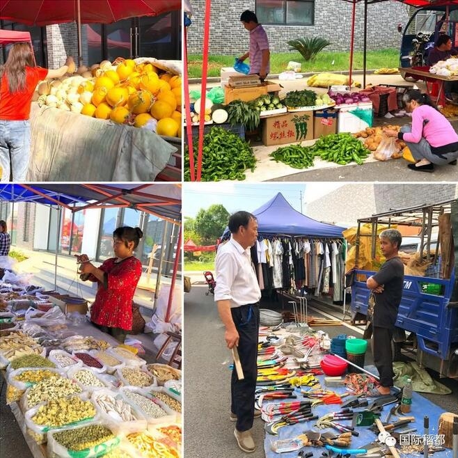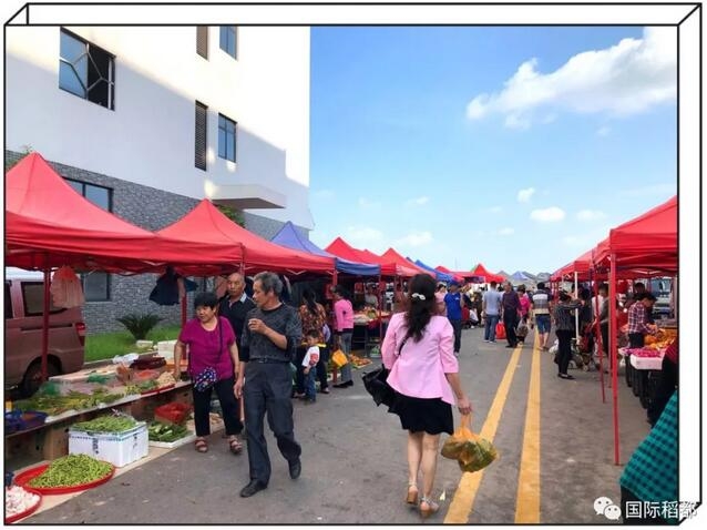 每月4号、14号和24号,国际稻都现代农业科技产业园里都热闹非凡——附近几个镇上的居民都来这里赶集了。每月逢4的日子,就到国际稻都来赶集,这已经成为周边村民的一个惯例。据他们说,赶集的地方有好几个,但是国际稻都这里的场地是最好的。交通方便,环境也很整洁。摊贩们有组织地在白墙黛瓦的产业园沿着街巷搭起彩棚,构成一个个临时“商铺”。