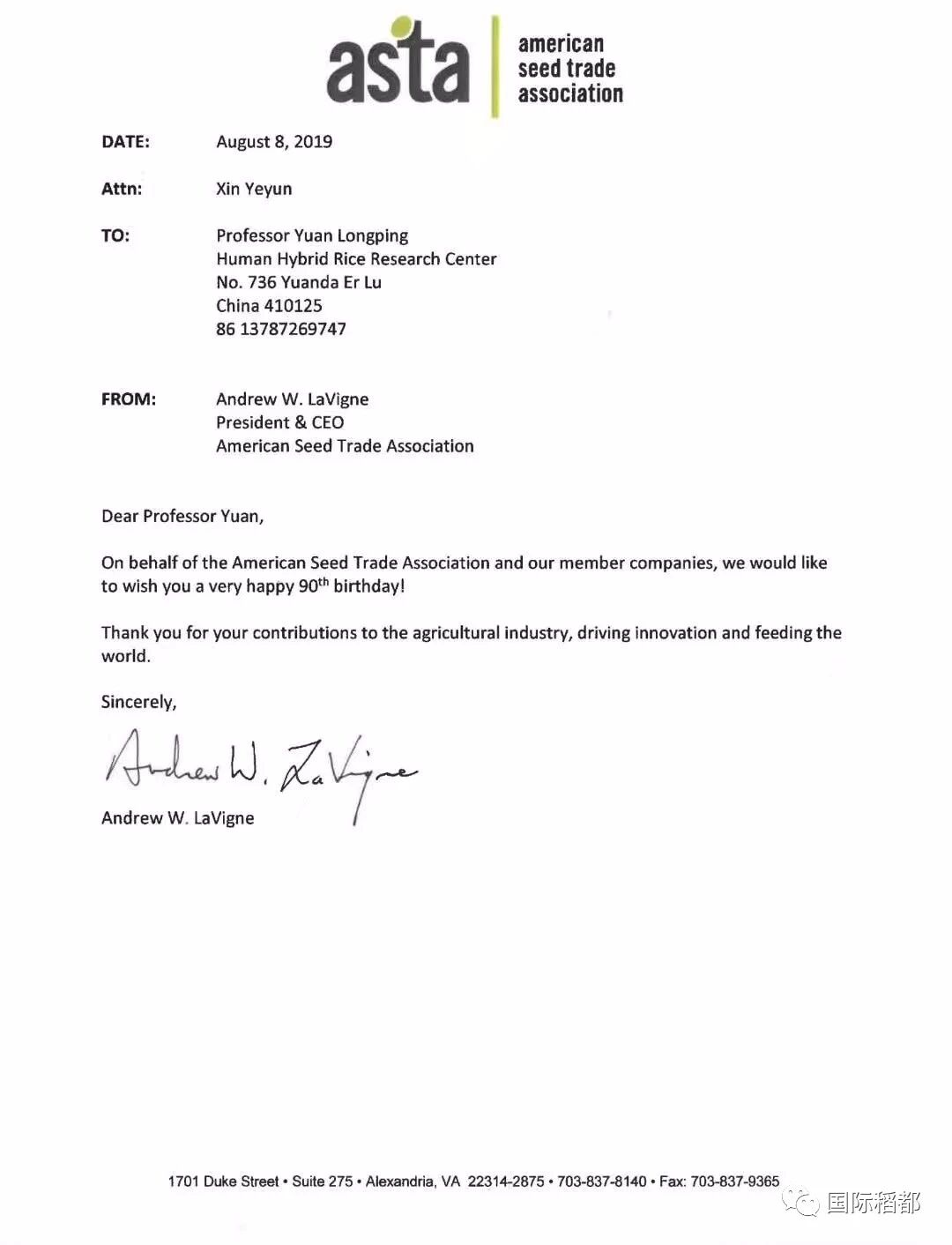 美国种贸协总裁为袁隆平院士90大寿献贺词!
