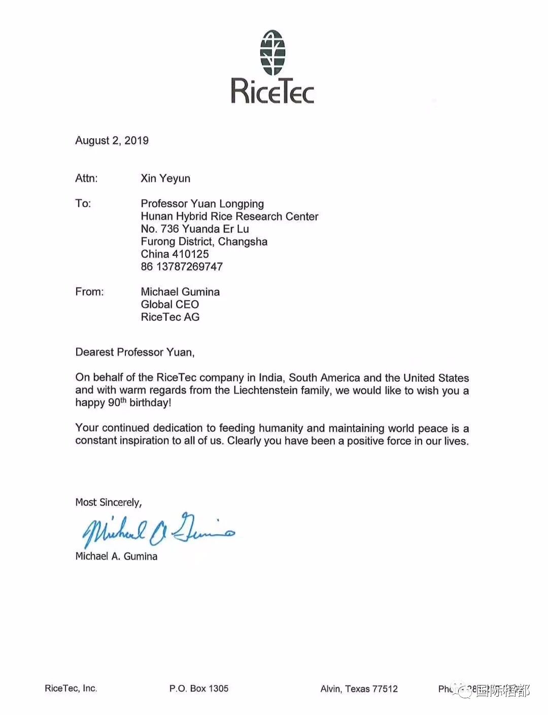 美国水稻技术公司总裁为袁隆平院士90大寿献贺词!